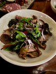Тартар из говядины с добавлением маринованного огурца, каперсов, красного лука, лука-сибулета, изюма и грецкого ореха. Заправляется классическим соусом айоли с горчицей. Подается под эспумой из пармезана и тертым сыром пармезан