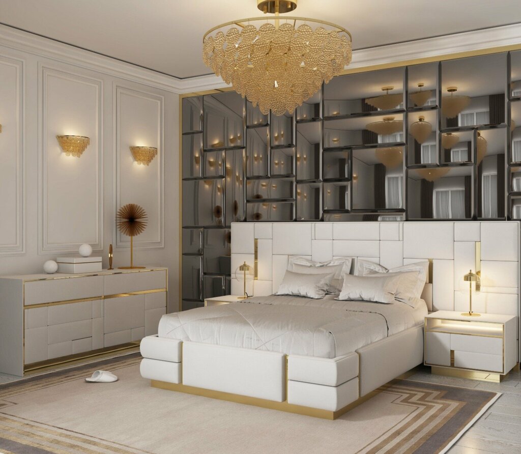 Вы можете приобрести готовый комплект: кровать, 2 тумбы, шкаф, гипсовые панели.