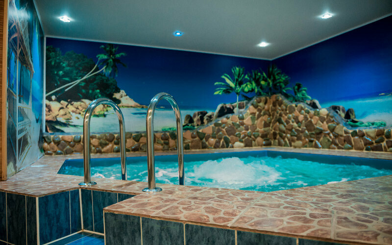 Средний зал вместимость до 6 человек, инфракрасная сауна, бассейн с гейзером, круглосуточная система фильтрации воды 5-й час со скидкой 30% Именинникам скидка 10% Подробности у администратора 43-80-20