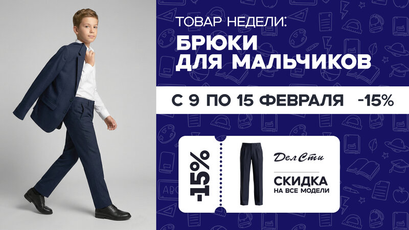 С 9 по 15 февраля брюки для мальчиков со скидкой 15% во всех магазинах сети и интернет-магазине www.delsty.ru. В акции участвуют все модели!