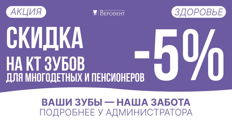 Скидка -5% на КТ зубов - для многодетных и пенсионеров! Акция в стоматологии Веродент в городе Видное! Ваши зубы-наша забота! *Подробнее у Администратора