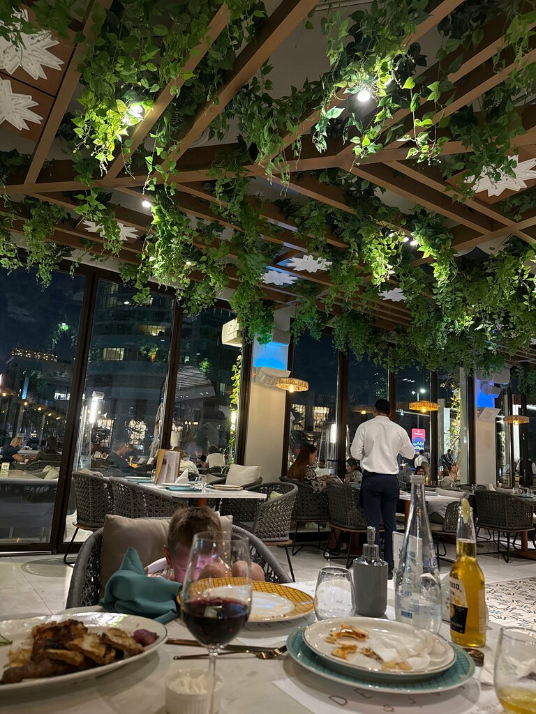 Good afternoon, it's strange that this place has a score of 4.6. These are most likely local people who smoke hookah here and drink cocktails. The place is atmospheric, you can't say anything, but the food is a problem. We had lunch here with 2 children. I ordered seafood soup. French fries for children + chicken wings for children (before that, they asked if they had any sauce or not. There is no sauce, the waiter told the children). My wife ordered a Moussaka. Now for the points: 1) Soup (45 dirhams)- in short, this is a liquid broth of some kind from a bag with 3 shrimps and one octopus. 2) Wings (50 dirhams). I kind of felt like it wasn't worth taking them. They brought a bowl of wings, 8 pieces with local sauce, a rare rubbish. The most expensive wings I've ever eaten. 3) French fries without question, the children are happy. 4) Moussaka was served with local inflated tortillas. The taste is far from wow. Total: staff-5, atmosphere-5, waiting time-10 minutes (5 points), food- 2, interior - 5. The restaurant-cafe is not for lunches and dinners, but for smoking a cigarette, hookah, and having a couple of cocktails. Cons: expensive food is not worth the money. I'll give you 2 points.