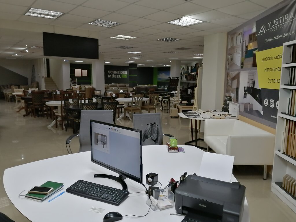 Дизайн-студия, делают мебель только на заказ, на втором этаже. Вообще в магазине есть и готовые столы, стулья, шкафы и кресла, а также хороший выбор люстр. Цены разные, продавцы внимательные, впечатление, в целом, положительное.