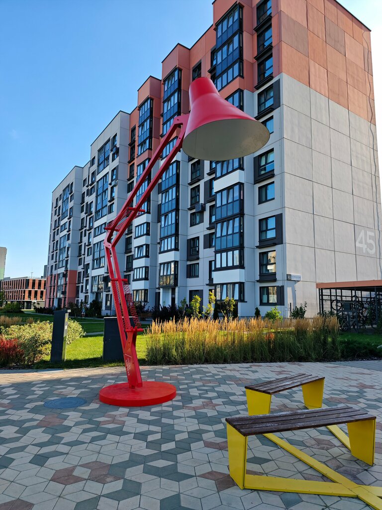 Very stylish lamp, decoration of the area. Cool color combination: yellow benches and a red lamp. It is convenient to sit, relax, and is very functional as a reference point for a meeting