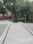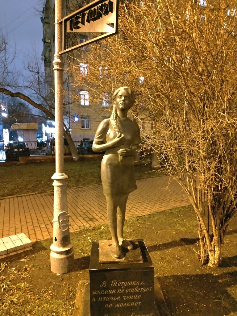 Вот прямо такая, как Венечка и описал. Парная скульптура к скульптуре самого Венечки. Маленький уютный сквер в абсолютно неудобном месте с неудобоваримым адресом. Но глаз радует. Будете рядом - потратьте 10 минут.