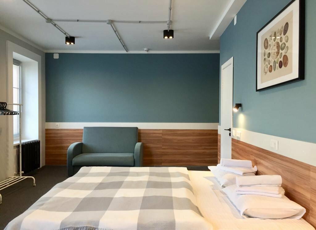 Гостиница по приемлемой цене при трёхместном размещении.Искали номер, именно, с тремя полноценными,спальными местами.Гостиница расположена на 2 этаже здания, на первом этаже располагается кофейня .Окна выходили на ул. Баумана, ночью с улицы шумно при закрытом окне, мы это учитывали при бронировании. Удобное расположение гостиницы : до Кремля - 10 мин., до ж/д вокзала пешком - 10-12 мин, все экскурсии начинались,тоже, с ул. Баумана.Вежливые администраторы, хочется поблагодарить Эльвиру за помощь в некоторых вопросах. Шумных соседей в гостинице не было, ночью на этаже тихо.В номере - телевизор, кондиционер. Есть одноразовые тапки.Около каждой кровати есть розетки.В ванной - шампунь в индивидуальной упаковке , гель для душа и жидкое мыло- в дозаторе. На этаже - холодильник, микроволновка,электрический чайник,кулер с водой, гладильная доска и утюг, комната для хранения багажа.В ванной течёт смеситель,перепадов температуры воды не было, но начинаешь принимать душ и вода заканчивается, через некоторое время появляется. Мусор выносили,шампунь не пополняли, полотенца немного потрёпанные. В ванной, на полу много волос от предыдущих жильцов.