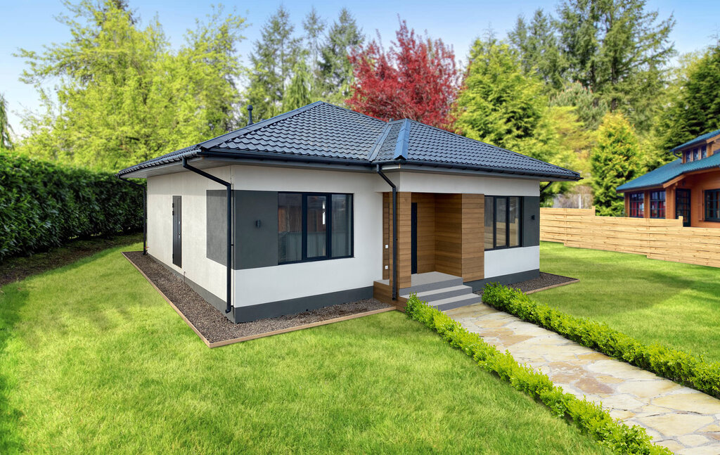 Дизайнерский дом "Фемили" на 95 м² с террасой 18 м² и отделкой «ДИРБИ WHITE BOX PLUS» на участке 10 сот., огороженным забором с габионами