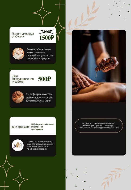 Cosmetology services:arsonvalization, make-up, biorevitalization, noninjection mezotherapy, anti-age procedures, mezotherapy, acne treatment, juvederm, botox, photorejuvenation, lifting, hardware cosmetology, facial, eyelashes/eyebrow coloring, ultrasound, injection iposuction, contour correction, injection lipolysis, cosmetic tattoo, tumors removal, peeling, body care, removal vascular defects, scar removal, injection procedure, eyebrow correction, cleansing, plazmalifting, restylane, dysport, epilation, collagen, fractional thermolysis, fractional resurfacing, vacuum massager, non surgical skin lifting, figure correction, facial massage, laser rejuvenation, lip augmentation, permanent lip makeup, tattoo removal, permanent makeup removal, carboxytherapy, microcurrent therapy, scrubbing, removal of the vascular network, carbon peeling