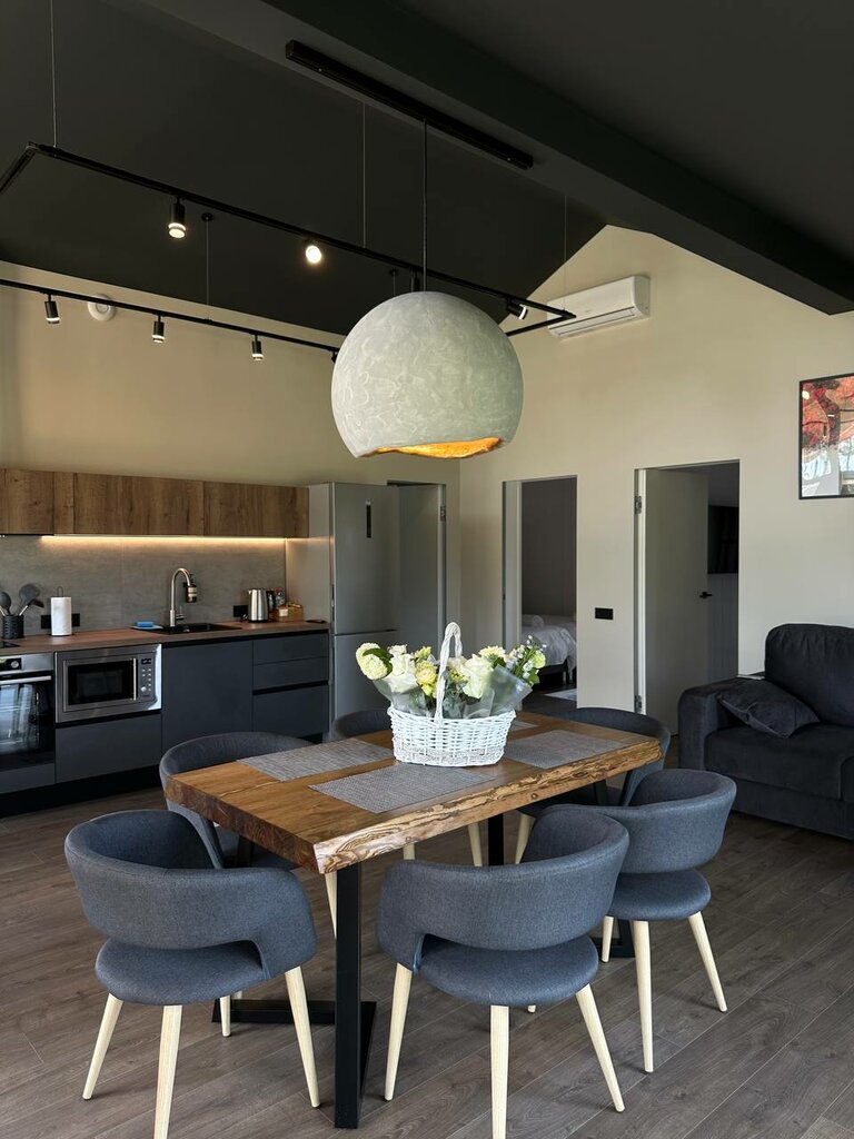 Люкс "Жизнь Прекрасна" Большой (40 кв.м.) видовой номер класса люкс в стиле «Шале-Модерн» с отдельным входом, камином и панорамными окнами, большой крытой террасой, уличной мебелью и оборудованной зоной барбекю. В номере: - Большая двуспальная кро...