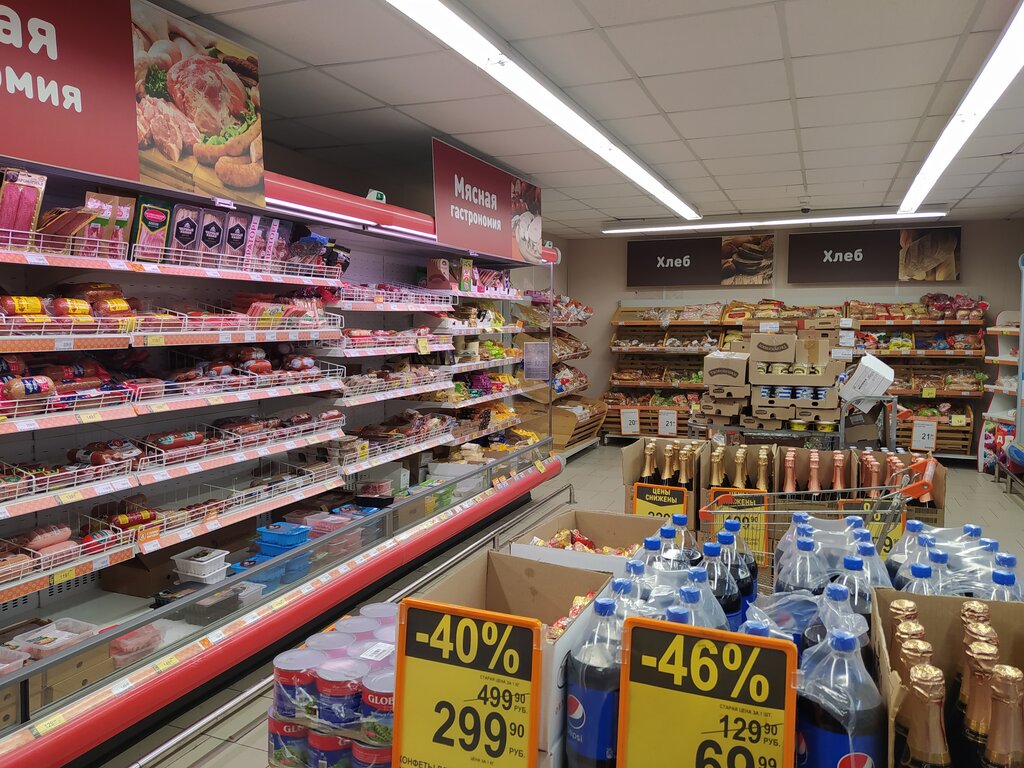 +Хорошая зелень(ибо в холодильнике). +Частые акции(например покупал там печенье Юбилейное за 19-90 и за 14-90). +Удобно расположен. +есть недорогая молочка и сладости на грани просрочки - Часто обманывают с хитрыми ценниками(типа 1+1 или 2+1) -Нередко на ценнике одно, а над ценником другое Но это везде так, будьте внимательны:)