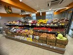 Удобнл что работает до позднего вечера. Можно по пути поиобрести продукты. Хороший выбор фруктов и овощей. Холодильник с рыбой наполнен хаотично. Не на все виды рыбы есть ценники. Что бы найти указанную на ценнике рыбу надо рыться перебирая пакеты с рыбой.