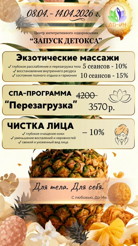 Была в До-ин у косметолога Оксаны на чистке лица, очень понравилось, делает оккуратно, никакого дискомфорта, буду посещать ещё. А также впервые была на спа процедуре "Имбирный коктейль" Это невероятный релакс. Массаж делала Лина, после процедуры такая легкость во всем теле. Вышла обновленная! Так, что если вам хочется отдыха, релакса, а в отпуск съездить нет возможности, то спа процедуры самое то, на два часа точно отвлечетесь от всего. Главное не забыть на это время включить авиарежим в телефоне 😉