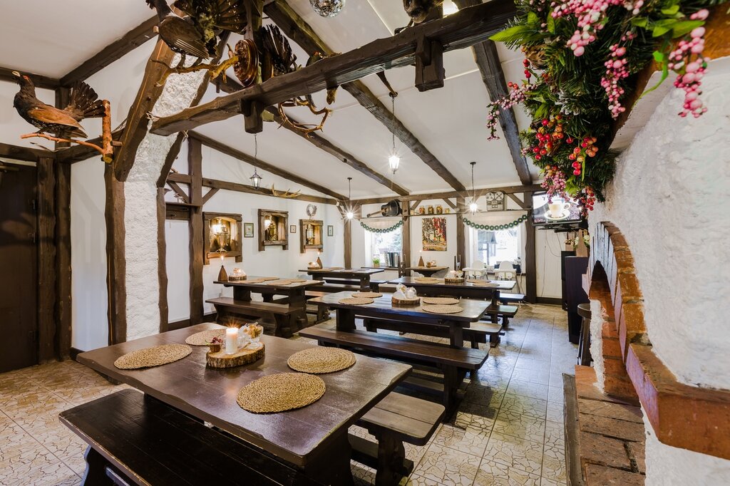 В целом неплохое место. Может мы просто не те блюда выбрали или на вкус и цвет, как говорится. Ценник адекватный, территория своя огороженная, так как это целый загородный комплекс, есть столики на улице. Внутри довольно все просто в стиле охотничьего кафе - чучела животных по стенам. Финская уха (не помню как правильно называется) очень вкусная. Штрудель так себе - как будто из слоёного теста и в качестве соуса сгущёнка. Пельмени с лосем заказывали дети и сказали, что "сибирская коллекция" вкуснее🤷‍♀️ Мохито б/а клубничный - просто тоник с сиропом. Мы сели за столик внутри у окна, там, где чучело глухаря висит недалеко. Когда сын выходил, он стукнулся головой об палку, на которой этот глухарь сидит. Очень неудобное расположение:( Мы подумали, что сын не первый, кто так стукнулся. Перевесить бы глухаря. Так что аккуратнее.
