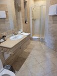 Это роскошный гостевой дом! Мы жили в номере «Апартаменты с сауной», ну, это можно сказать полноценная однокомнатная квартира, если сравнивать с 24-мя метрами номеров типовых гостиниц. Ванная комната с электрической сауной, в принципе не плохо, можно погреться. Теплые полы в ванной, прекрасная сантехника, белоснежные халаты. Огромный номер с эркером и миникухней, где всё есть. В номере новая мебель, чистое белье. Один единственный минус здесь - холодный пол в номере (первый этаж), без тапочек ходить совсем не приятно.