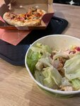 пиццу и салат цезарь ждали больше часа, после того как все таки выловили сотрудника которых не было на кухне нам сказали еще не готово отходить мы не стали и стояли ждали они достали пиццу которую уже давно положили в коробку которая успела остыть и салат цезарь который 20 минут просто стоял на столе