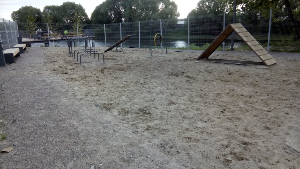 На песке прекрасно видны следы лап собак разных пород. На площадке есть несколько видов узких дорожек, кольцо, барьеры разной высоты, много лавочек и урны для хозяев. Площадка огорожена и калитка закрывается с обеих сторон.