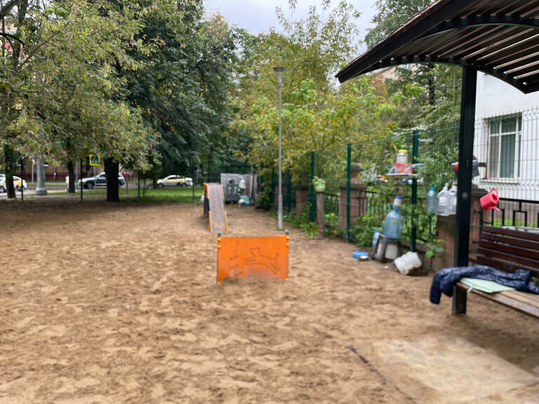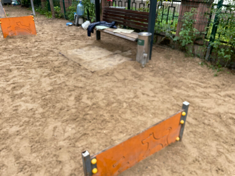 Площадка маленькая, собак много, некоторые агрессивные. Песчаное покрытие, очень пыльно. Есть кое-какие снаряды. Местечко довольно приятное. Местные собачники сразу предупредили, что если мы хотим сюда приходить, нужно платить каждый месяц 200 рублей за услуги дворника. Время посещения тоже как-то поделено: с шести часов гуляет мелочь, с восьми приходят крупные собаки – нам рекомендовали уйти до их прихода.
