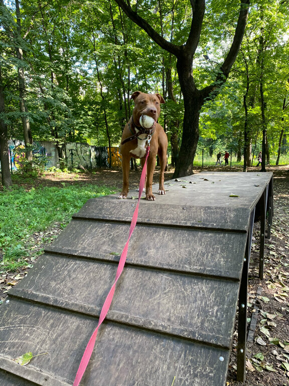 Огромная, таких никогда не видел. Собака набегалась, так как никогда. Также, есть все для того чтобы позаниматься с ней, лестницы, барьеры и прочие препятствия
