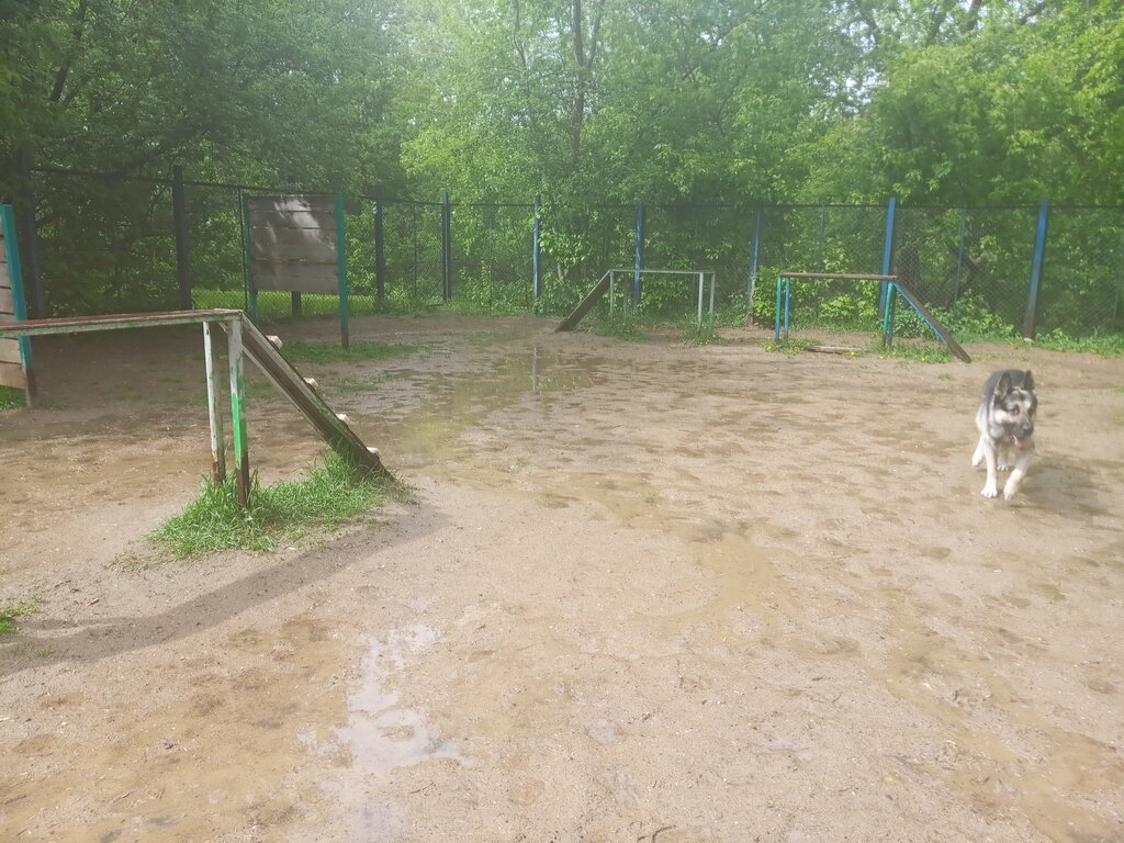 1) Площадка небольшая. Разогнаться только если кругами бегать. 2) Покрытие - песок (при дожде лужи, когда сухо - пыль висит от бега собак, кидаешь игрушку - она вся в песке и собака от него откашливается потом). 3) Забор-сетка около 2м. Калитка нормально закрывается, но под ней яма и маленькие собачки спокойно убегают/забегают при закрытой калитке. 4) Препятствия: 4 барьера(0,5м, 1м, 1,5м и 2м высотой) в ряд; окоп/речка-трамплин высотой 1м; второй - разноуровневый, прыгать на нем далеко - мой овчар не сразу его взял, так что это для крупных собак; трап (лесенка + 2 ступеньки) размером для средних собак; по центру площадки ужасный бум - узкий(в ладонь шириной), высокий и с большим уклоном. В общем, препятствия почти все прыжковые, на небольшой площади, стоят плотно, в кривом порядке. 5) Чистота всегда на уровне, есть две урны, совок и пакетики сами собачники обеспечивают.