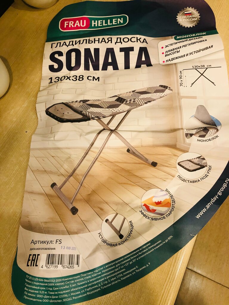 Беспрецедентное отношение к потребителю! Гладильная доска соната. Только сюрреалистичные мозги могли придумать доску треугольной формы с рабочей прямоугольной поверхностью в 40 см для глажения. Все остальное зауженный клин бесполезный. Металл или не металл легкий, непрочный, гнется от процесса глажки, сварочные швы с браком, неустойчивость доски, гнется металл, додумались чехол сделать из ситца вместо водоотталкивающей ткани. Деньги на ветер, доска на помойку! Если бы не онлайн покупка там не видно весь этот беспредел, никогда бы не обратила внимание на такое убожество!!!!! Смотри фото!!!!!!