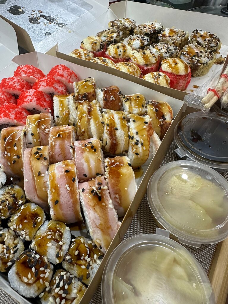К качеству самих роллов претензий нет, все свежее и вкусное. Но доставка- это просто кошмар. Заказ был сделан 4 июля, доставлен курьером в районе 17:15, курьер был на машине- это как надо водить, чтобы роллы приехали в таком состоянии? Абсолютно во всех коробках роллы были всмятку, весь топпинг размазан по крышкам коробок. Брали роллы в дополнение к праздничному ужину, но такое месиво стыдно поставить на стол. Сразу после того, как открыли коробки- написала в сообщения группы, приложив эти фото. Сегодня 8 июля, но никто не связался со мной, даже не принесли извинений. Клиентоориентированность просто отсутствует. Дополняю отзыв 09.07: после отзыва со мной связались, принесли извинения, предложили пути решения возникшей проблемы. В целом, готова далее заказывать здесь так как к качеству еды изначально не было претензий. Но буду теперь пользоваться самовывозом)