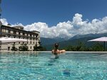 Порадовались, что для проживания в Красной поляне выбрали этот отель! На канатке до отеля поднимаешься, показав ваучер на проживание охране канатки. Далее заселяешься (или, если по ехал рано, можно оставить чемоданы). Все ухожено, номер просторный и чистый. Огромная кровать, большая душевая. Есть чайник, кофемашина, чай, кофе и т.д. Все гигиенические штуки тоже кладут. С 7 до 11 завтрак. Спа в сентябре с 10 утра, а бассейн на улице - с 7 (в сентябре, дальше мб будет попозже открываться). До 10 утра проход к уличному бассейну мимо ресепшена, после 10 - через спа на -1 этаже. Там ещё бассейн в помещении, шезлонги для отдыха, а также сауна и хамам. Особенно понравился уличный подогреваемый бассейн - вода 32 градуса и вид на горы!! За состоянием бассейна следят, также всегда рядом спасатель. Также в отеле шведский стол - вкусно и разнообразно, есть шампанское) Сам район (высота 960) тоже понравился: вайб европейского курорта, аккуратная архитектура, приятная музыка на улице, высаженные деревца, рестораны на разный вкус