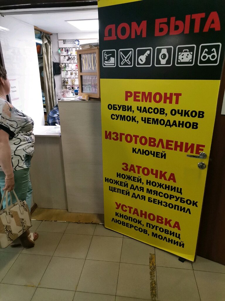 Сейчас в Доме быта, куда я ходж уже много лет, появился новый мастер по ремонту обуви, изготовлению ключей и других мелочей. Мастер просто супер!!! Вежливый, обходительный, а главное, настоящий профессионал. В отличии от предыдущего мастера, никакого хамства, пунктуальный, отдаëт всë в срок. А это очень важно. Я очень довольна работой всего Дома быта! Процветания им и хороших клиентов!