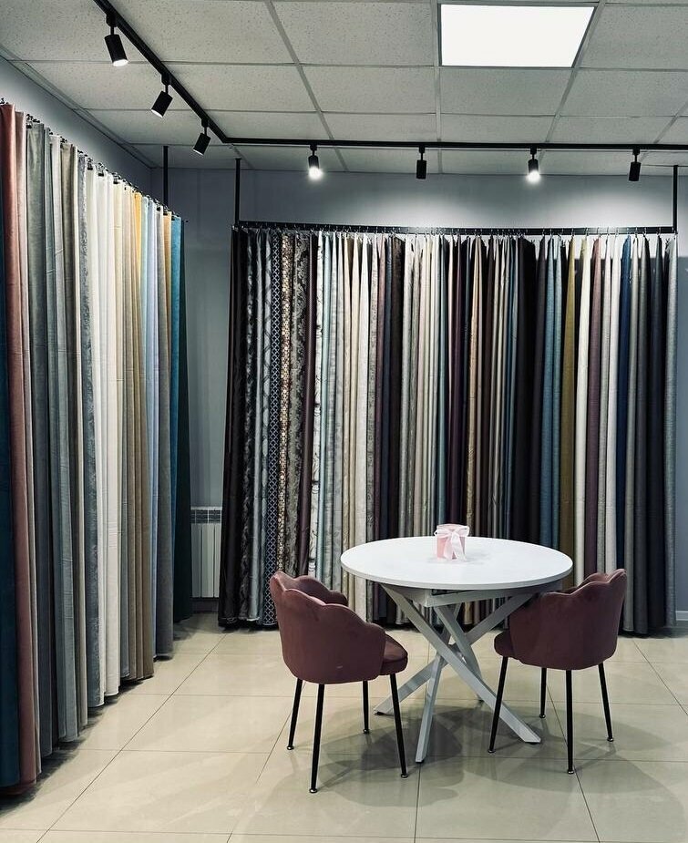 Хороший выбор не только ткани,но и фурнитуры от магнитов прихватов до карнизов,и есть такая замечательная услуга под ключ,то есть производят работу от замера,монтажа,3д проекта до вывеса. Данный салон рекомендую 💜
