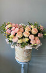 Букет с нежным хлопком, тремя видами роз и эвкалиптом