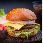 Булочка с кунжутом, котлета из телятины, бекон, яйцо, сыр чеддер, огурец маринованный ,томат, салат айсберг с соусом гриль.