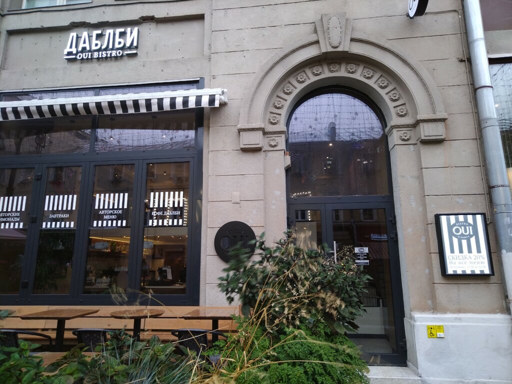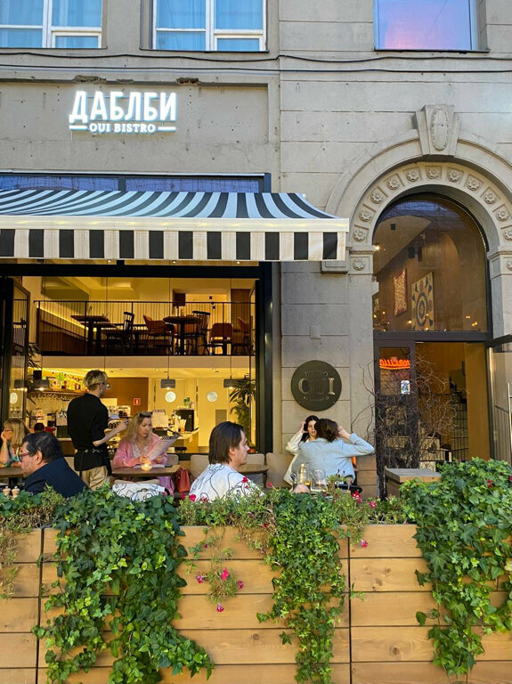 Был на свидании прохладным летним вечером, меня грели любовь, плед, свеча, еда и вино :). Название ресторана оказалось простое (не знаю французского) - перевод с французского «Да». Место на улице уютное, с видом на Оперетту…улица шумновата была до первого бокала вина. В общем очень вкусно и по французски маловаты порции для меня, но как не странно наелся с одного салата и половинки «пиццы». Есть баланс вкуса не только в еде, но в интерьере. Дабл Би - качество на уровне. Официанты очень внимательны. Хочу зайти в следующий раз и попробовать остальные блюда. Желаю видеть больше французского в этом ресторане…