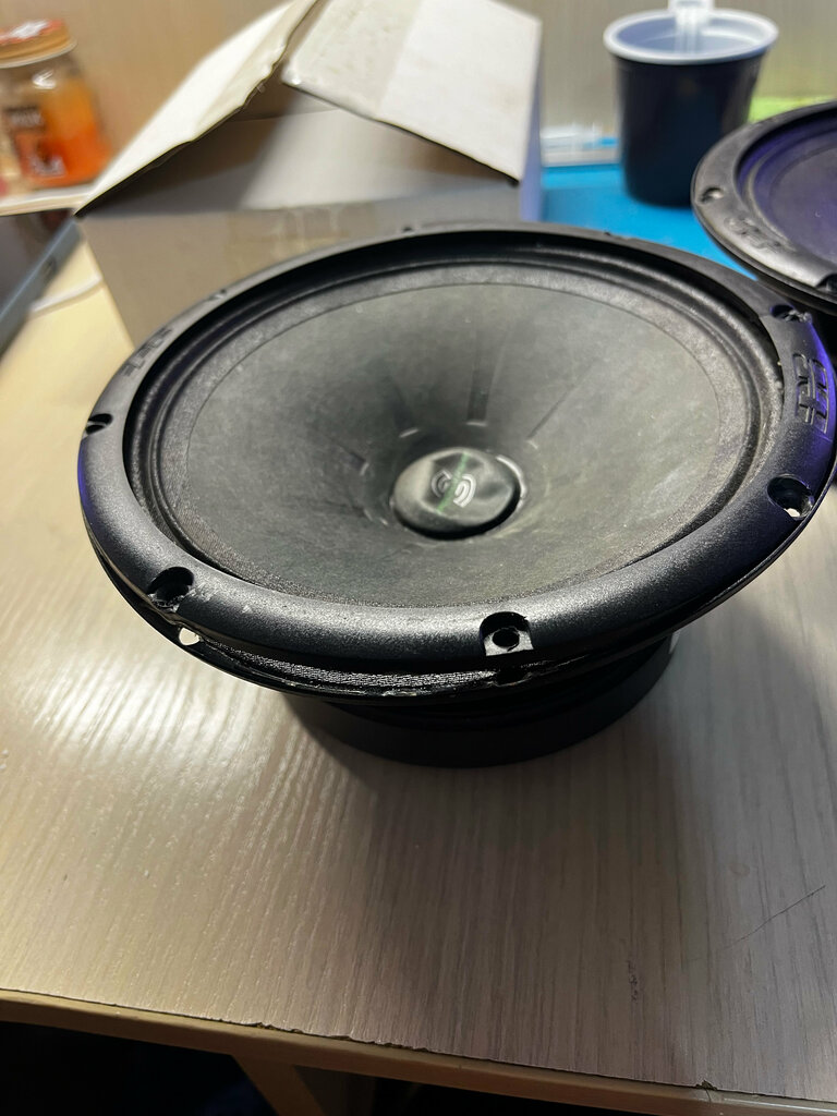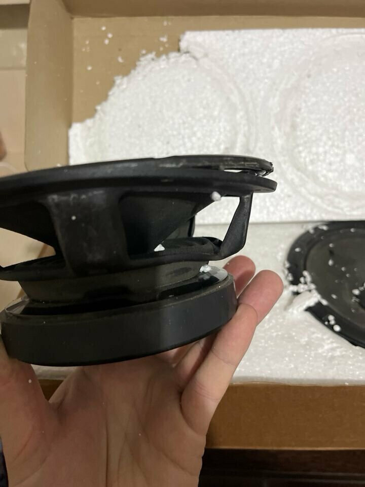 Ужасная доставка, во первых приехал в первый раз хотел получить но за жену это сделать нельзя было, ну и это цветочки, жена товар получила без проверки, дома достал а они оказывается повредили динамик и ладно бы подвижную часть, но это металическая корзина была. Первое фото как было, последние 2 как приехали, динамики покупались для замены подвижной части, но с повреждением корзины, один уже практически не реально восстановить. Подложка в коробке пенопласт и он был сломан в месте изгиба.