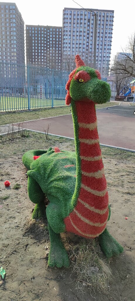 Обновленный Дракон рядом с новой благоустроенной детской площадкой по последнему городскому дизайну,Площадка и корт для занятий футболом, баскетболом а также волейболом расположен недалеко от нового дома возведенного по программе реновации Детям нравится эта площадка.Сюда приходят проводить досуг дети из домов с ул Мневники, 10, просп.Маршала Жукова ,д 11.15 и 17 .