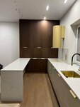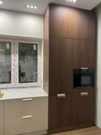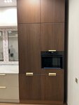 Хочу поделиться впечатлениями о нашей новой кухне! Долго выбирали подрядчика, изучали отзывы, и в итоге остановились на Дриаде - и ни разу не пожалели. Кухня в итоге вышла просто шикарная! Темные фасады с вертикальной текстурой смотрятся очень стильно и дорого - это вообще фишка всего интерьера сейчас. Нижние шкафы сделали в светло-сером матовом цвете, что отлично контрастирует с темными колоннами. Столешница из искусственного камня (похоже на кварц) - белая с еле заметными разводами, выглядит как натуральный мрамор, но при этом практичнее. Отдельная любовь — вся фурнитура под латунь/золото. Мойка золотая, смеситель черный с золотыми элементами, и все ручки на шкафах тоже в этой гамме. Поначалу переживали, не будет ли слишком «золото everywhere», но в итоге смотрится очень гармонично и современно. Вытяжку выбрали необычную - цилиндрическую, желтого цвета. Она стала таким ярким акцентом на темном фоне. Встроенная духовка встала идеально в высокую колонну. Отдельное спасибо хочу сказать Семёну, который вел наш проект от начала и до конца. Это вообще редкость сейчас - когда один человек сопровождает тебя от первого эскиза до финальной установки и не бросает на полпути. Семён помог определиться с планировкой (у нас не самая простая форма помещения), подсказал по эргономике, где лучше сделать ящики, где распашные дверки, чтобы было удобно пользоваться. Когда мы сомневались с цветом, он привез образцы, мы дома прикинули при нашем освещении. И что приятно, никогда не навязывал свое мнение, а именно помогал найти наше решение. По срокам тоже все четко - изготовили в оговоренное время, установка заняла пару дней. Монтажники работали аккуратно, после себя убрали. Кухней довольны на 100%! Качество материалов отличное, все подогнано идеально, ничего не скрипит, не люфтит. Если будете заказывать кухню, рекомендую ребят из Дриады, а особенно обращайтесь к Семёну, с ним точно не пожалеете!
