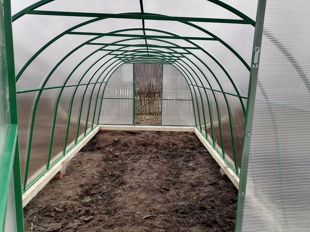 Теплица арочная шириной 3 метра или 2,5 метра, из профильной стальной трубы 20х20 с толщиной стенки металла 1,2 мм, изготовлена из цельных арок, каждая из которых усилена ребром жесткости.