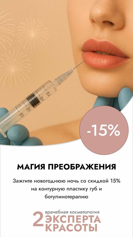 «Магия преображения: зажгите новогоднюю ночь со скидкой 15% на контурную пластику губ и ботулинотерапию весь декабрь. Встречайте Новый год...