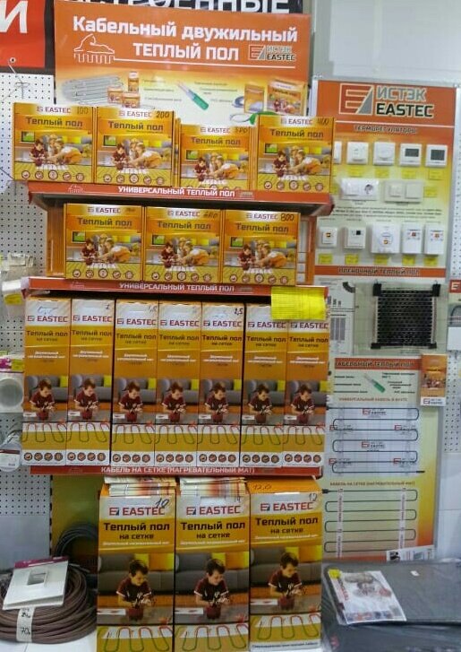 Отличное место. Брал терморегуляторы, встраиваемые в рамку Legrand - отличное качество: плавный ход кнопки включения, идеально входит в рамку: по цвету и по размеру. Брал саморегулирующийся теплый пол пленочный под паркет, удобно что есть разные размеры: 50, 80, 100. Мне как раз в комнате шириной 2,5 метра удалось оптимально покрыть площадь. Рекомендую!