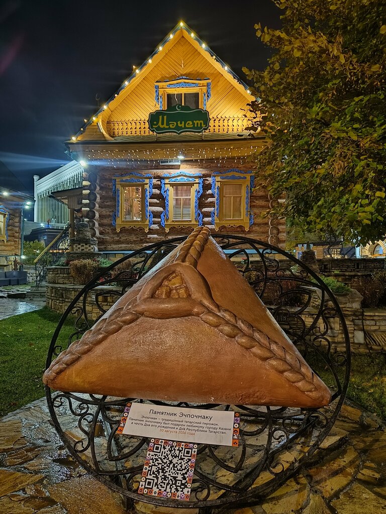 Милый экспонат знаменитого татарского эчпочмака, хотя на мой взгляд не совсем уместно было ставить его рядом с духовным и религиозным местом - мечетью. Есть примета : если потереть эчпочмак и загадать желание, то оно сбудется! Сама татарская деревня очень красочная вечером, попадаешь в настоящую сказку!