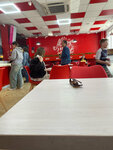 Это было великолепное посещение (первое причем) этого заведения. Часть первая: Вход. Так как сегодня происходил ремонт фасада здания и ремонт вывесок, то на входе во весь фасад установлены стоительные леса и идут работы, то вход был затруднен. Несмотря на летящие искры от болгарки прямо на голову посетителей удалось проникнуть внутрь. Часть вторая: Заказ еды. Немного успокоившись от перенесенного стресса на входе, приступили к изучению меню, на стандартный вопрос о возможных "комбо" (это когда не нужно разбираться в особенностях и получить просто поесть и попить в фаст-фуде) ответ прекрасных (правда) сотрудников было сказано что комбо есть, но разобратьься в непривычных названиях под звук болгарки и саундтрека (о нем позже) оказалось остаточно проблематично. Однако было принято решение изучить по названиям и фото и сделать заказ по стандартам обычного посетителя фаст-фуда: чизбургер, крылышки, картошка фри, соус к ней и напиток + вкусняшки. Как было выяснено в наличии ничего из вкусных по названию фкусняшек (сладких напитков и коктейлей) в наличии нет, как и сырных колечек к сожалению. Однако совместными усилиями заказ таки был сделан и успешно оплачен. Часть третья: Еда. Острые крылышки - не смотря на множественные переломы у некоторых крылышек, достаточно вкусно и хоть и не остро (панировка перемешана недостаточно, где-то остро, где-то нет) но сочно и вкусно. Чизбургер вполне адекватен, если бы булочки были поджарены хоть немного, то было бы отлично, но теплая курица между холодными булками врядли доставит мгновенное удовольствие любителям фаст-фуда (гостям города). Сырные палочки пока теплые (но не горячие, наверное чтобы никто не обжегся) терпимы и пригодны первые 4-7 минут после выдачи. Картошка фри - вот как можно на хорошем оборудовании, с таким прекрасным персоналом приготовить стандартный фри настолько плохо? Ведь за ним и идут. Несоленое, без корочки и относительно холодное. Ведь в этом весь смысл то по сути - макнуть в соус и хрустануть, а внутри разливающаяся по рту прекрасная картошка. А с учетом, что сырного соуса в наличии нет, то фри превратилось в блюдо, не приносящее удовольствие. Напиток. Такого шока никто не ожидал. При заказе звучало слово "Спрайт", но что в стакане окажется возможно разбавленное изделие от бренда "Добрый" это за гранью. Купите в конце концов наш местный продукт - в городе производят вполне вкусные и пепси и фанту и колу. Ладно бы было невкусно, но это сложно описать - запивать соленую пищу привычно сладким и газированным напитком, на этом половина маркетинга построена. Часть третья: Выход из заведения Было принято решение часть недоеденной пищи забрать с собой и попросить пакет на кассе, однако и тут была неожиданность - всем клиентам выдавался стандартный крафтовый, красивый и удобный пакет из картона, но на нашу долю почему-то достался обычная пластиковая майка, что не очень удобно и эстетично, однако он был выдан. Как только был выдан пакет к нам подошла прекрасная и замечательная "менеджер зала" и спросила что можно с нашего стола забрать, конечно же была оказана максимальная помощь, в поднимании стаканов и еды чтобы она смогла протереть стол тряпочкой и приговаривая "о, стол сейчас будет свободен", мы ни в коем не осуждаем такие действия. Все хорошо - поел, уступи другому, пусть и не ушел и не доел. Часть 