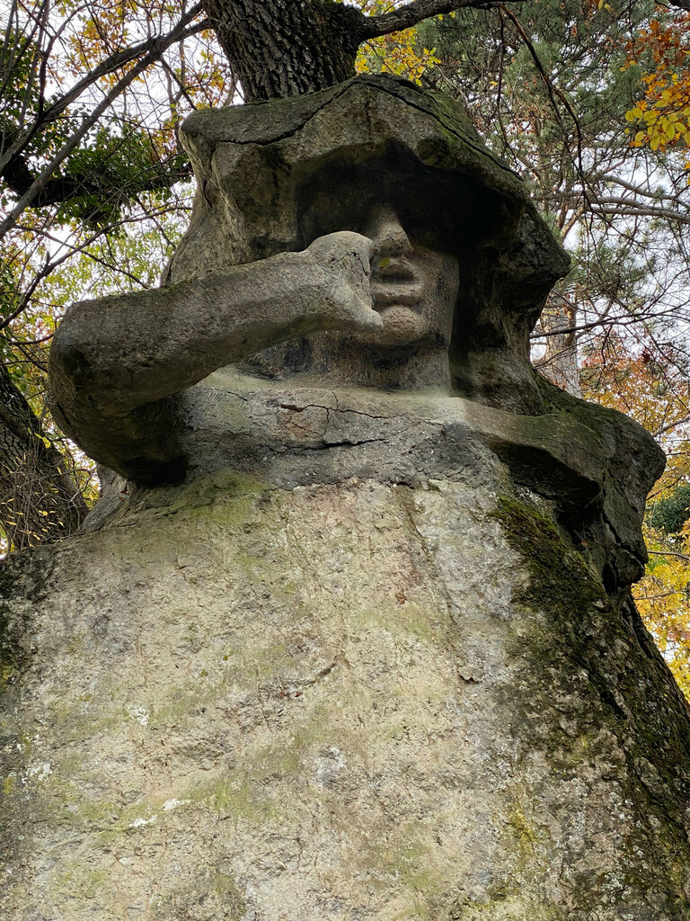 Скульптуру хорошо видно на Солнечной тропе по пути от Ливадийского дворца метрах в 400 в сторону Ласточки. Вокруг каменной глыбы текут горные ручьи и часто грязь. После очередного шторма в начале декабря 2021 упало старое дерево и люди вынуждены обходить, натоптали дорожку. Как велосипедисты теперь педалят не видела, но по незнанию, могли и упасть. Однако администрация Ялты не торопится чистить от старых засохших деревьев и кустарников чудесный парк из разных пород деревьев и кустарников туристические тропы и маршруты. Надеюсь, хоть кто-то им подскажет...