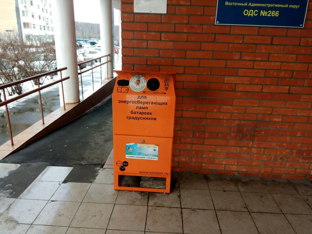 Бокс приема батареек и энергосберегающих, не диодных, ламп и ртутных градусников. Установлен удобно. Можно припарковаться во дворе дома по соседству. И все таки также не решает задачи раздельного сбора бытового электронного мусора, легкой бытовой техники.