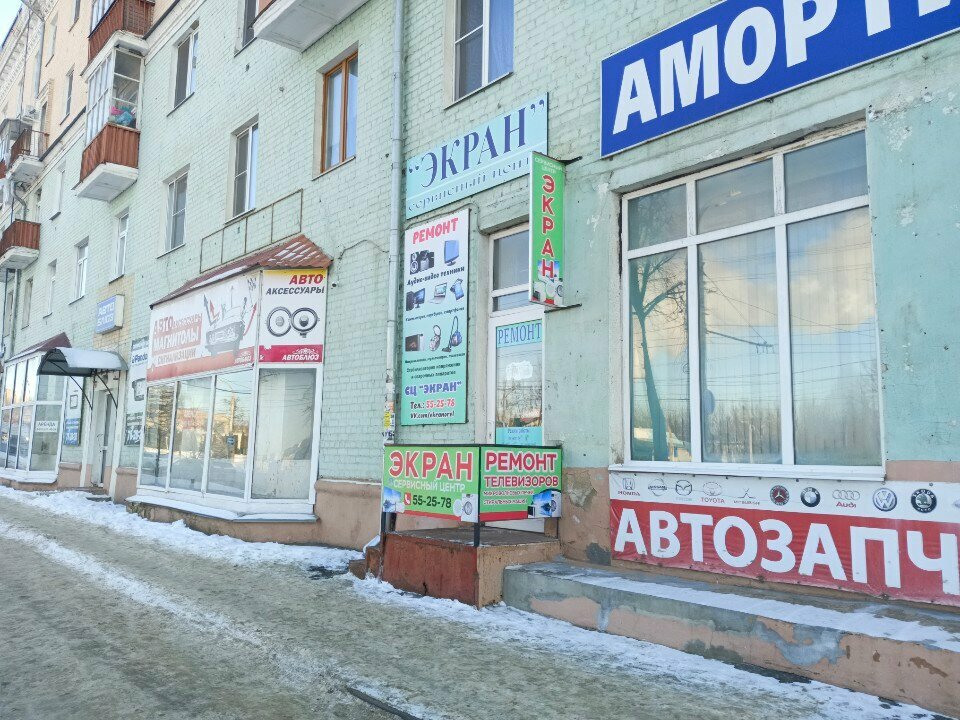 Мастерская Экран это зелёная вывеска, Экран Плюс это жулье ( синяя вывеска) , владелец косит под настоящую мастерскую Экран.