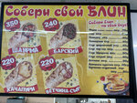 Сегодня заглянул в это местечко. Интересно было попробовать блины. Попробовал с фаршем и тартаром и ветчина, сыр, помидор. Цены в нынешних реалиях очень демократичные. С фаршем даже 200 рублей не вышел, второй чуть дороже обошелся. Сам блин конечно туговат, тесто можно чуть легче делать. Начинка фарш мне понравилась, тартар нет. Это вообще не тартар. Соус этот делать не сложно, думаю можно отказаться от покупного и начать делать его самим. Ветчины не пожалели, сыр тоже сырный, есть вкус, не пластилин. Ну и помидоров достаточно. Да, масло используется сливочное, вкусное. В целом ожидал меньшего. Можно смело покупать. Да, очень понравился, вежливый и открытый персонал. Спасибо.