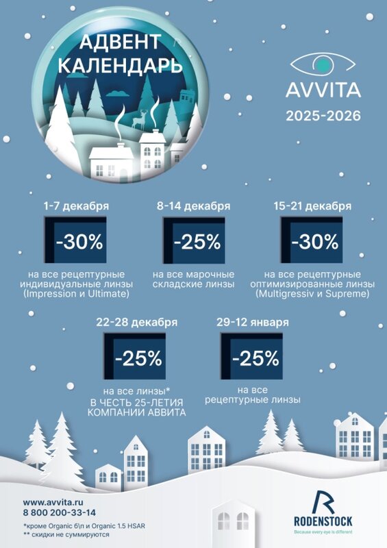 Новогодние скидки на очковые линзы RODENSTOCK до 30%. На весь ассортимент медицинских оправ скидка до 15%. На солнцезащитные очки до 20%. Ус...