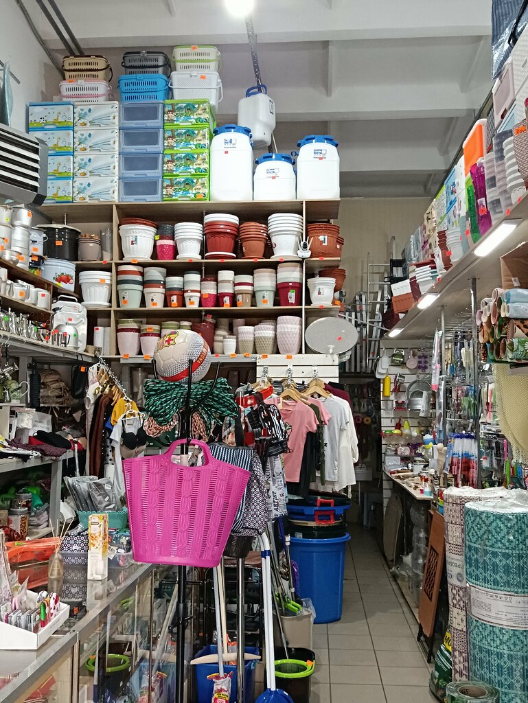 Магазин, где есть практически все. Горшки для цветов, земля для цветов, контейнеры, мусорные ведра, кастрюли, сковородки, стеклянные банки, ёмкости для воды. Часы, зарядки для телефонов. Детские ван ночки, стульчики, подножки к раковине, детские горшки, ковши. И многое другое.