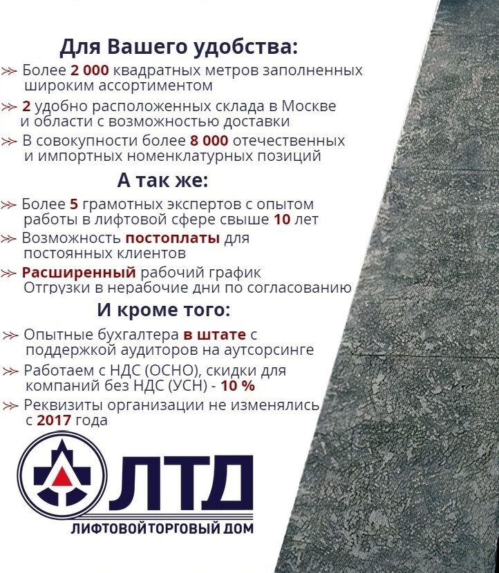 Заказываю запчасти для лифтов в компании ЛТД с 2018 года, очень доволен качеством запчастей, оперативностью поставки и профессионализмом сотрудников, всегда проконсультируюсь и помогут в подборе. Надеюсь на дальнейшее сотрудничество.