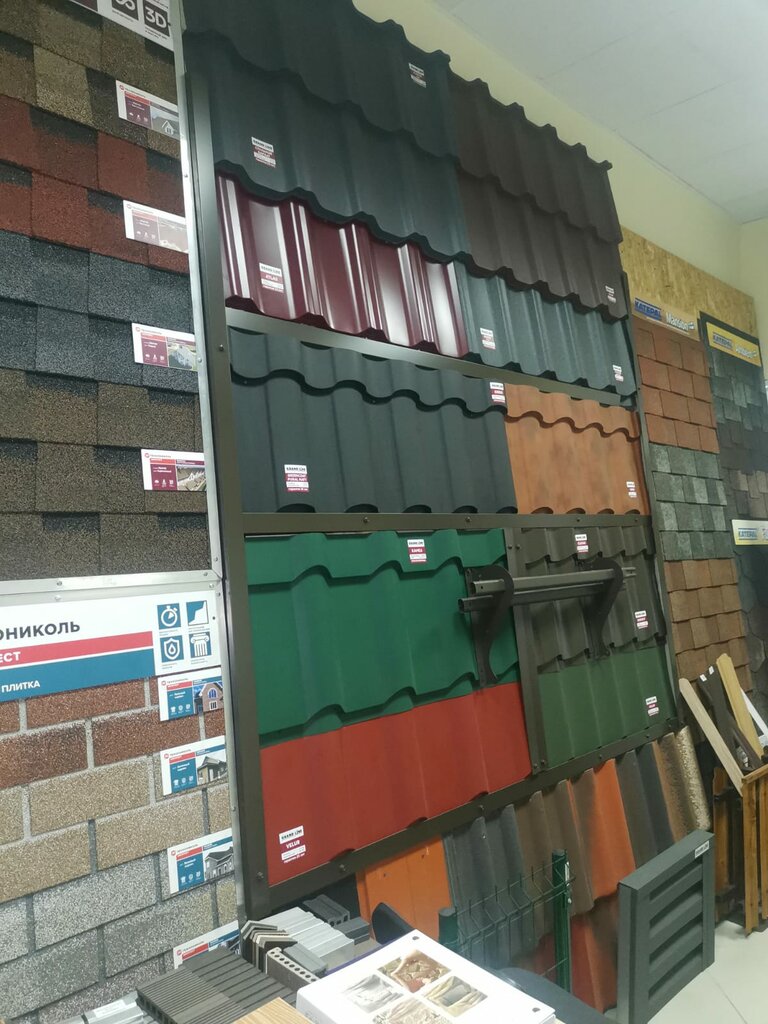 Небольшой офис, очень всё грамотно представлено. Не все правда образцы есть в наличии, но на какие-то можно попросить фотографии, они предоставляют. Рассчитывает необходимое количество материалв по чертежам. На кровлю, на фасады, на терраску. Поставляют в оговореннык сроки.