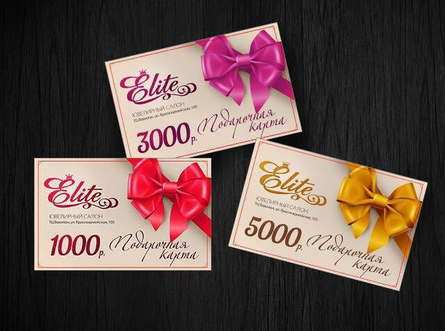 Лучший подарок на любой праздник - это подарочный сертификат ювелирного салона "Elite", приобретая его, вы предоставляете своим любимым возможность самим выбрать наиболее подходящие для них украшения.