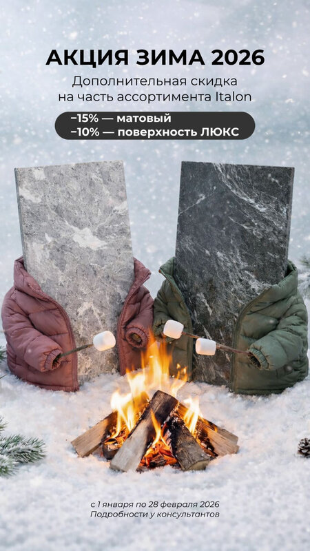 С 01.01.2026 по 28.02.2026 Дополнительная скидка на часть ассортимента Italon -15% -матовый -10% - поверхность ЛЮКС