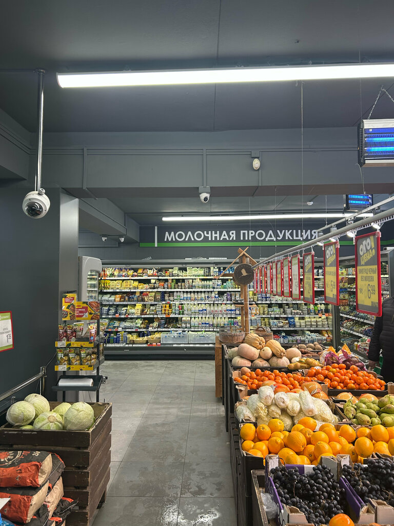 On the snow-covered steps (it was in January), I entered this cozy retail store for food. The doors are double, like in ministerial apartments, and the floor is slippery, like tropical coastal rocks, between them, as the sign printed on a black-and-white printer honestly warns. How did I end up here? What attracted an ordinary person to such a tempting lair of products? Perhaps it's the fault of a bored dog at the entrance, or a flirtatious green sign with the banal rhyme "Belmarket supermarket". Yes, not Balmont, and not even Gippius. But that's not the point! It's about sweet oranges, white, white yogurt, and eternally crunchy waffles. Everyone has their own list of products, but they are all arranged in a charming mosaic on these shelves. It's clean here. It's satisfying here. For introverts, there are self-service cash registers, for traditionalists, there are ruddy, neat cashiers counting out groceries and change with deft hands. A bag? No problem, even several types. And I ask you not to look down on this store. In the world of huge hypermarkets, it is in such grocery stores that the soul and kind, hardworking cleaners live. I recommend.
